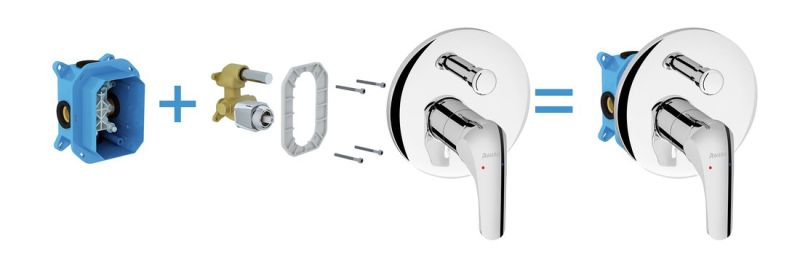RB 070.50 Встраиваемый механизм, который сводит к минимуму риск повреждения смесителя скрытого монтажа при монтаже или неправильной установке в стену. Работа по установке основного корпуса менее трудоемкая, более быстрая и результат ее значительно лучше. Пластиковый корпус защищает внутреннюю часть смесителя при встраивании в стену, а также облегчает все манипуляции.