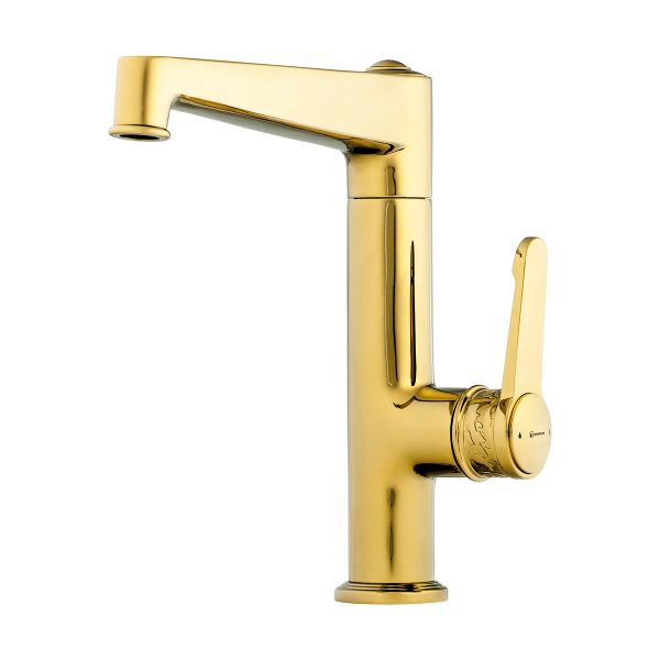 • Эксклюзивное сочетание современного и классического дизайна. Резьба на ручке; • Золотое покрытие (24 карата); • Высокий излив обеспечивает максимально удобное использование смесителя; • Высококачественная латунь сохранит воду чистой и здоровой; • Аэратор произведен из пластика, благодаря чему на нем никогда не появится известкового налета и ржавчины; • Коробка внутри проложена поролоном, который обеспечит сохранность изделия при транспортировке; • Полный набор креплений, соединительных шлангов, подробная инструкция и гарантийный талон в комплекте.