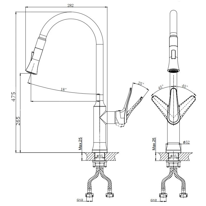 Смеситель для кухни RUSH арт. JA0735-24 с поворотным изливом и вытяжной лейкой из коллекции Jawa с металлической ручкой, изготовлен из высококачественной латуни и имеет рычажное управление.В смеситель установлен картридж D-35 с керамическими пластинами. Высота смесителя 486 мм. Излив поворотный 274 мм. Высота излива до аэратора 238 мм. Аэратор изготовлен из пластика с нержавеющим корпусом, угол наклона аэратора-18гр.В комплекте универсальная присоединительная группа для установки на горизонтальную поверхность, гибкая подводка с латунными гайками 40 см - 2шт, фум-лента, индивидуальный пакет, паспорт, гарантийный талон.