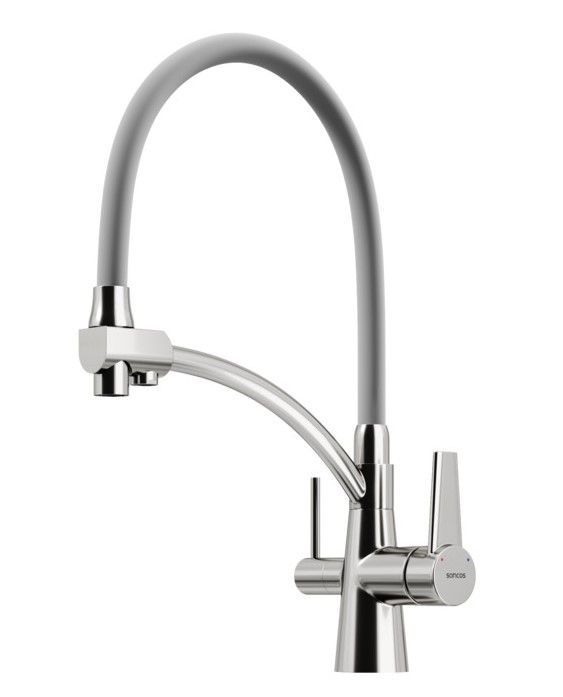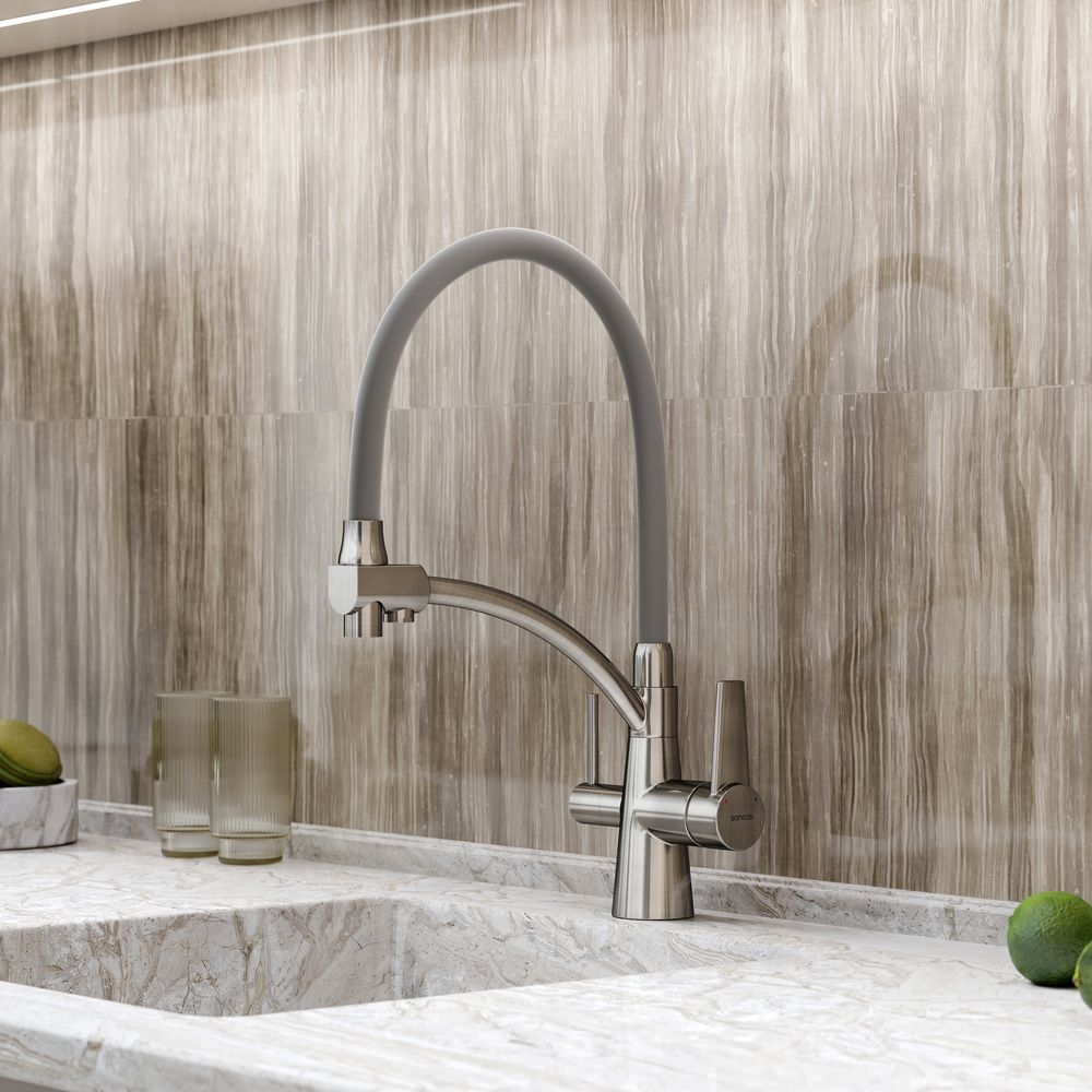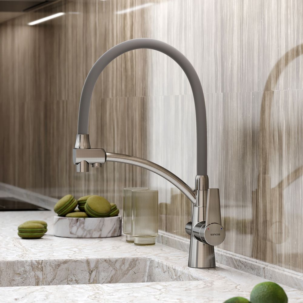 Смеситель для кухни SANCOS Eri с гибким изливом и возможностью подключения фильтра для воды, цвет брашированный никель, арт. SC4001BNС возможностью регулировки температуры водыАэратор, гибкая подводка, ключ и крепления для монтажа, ключ для обслуживания аэратора