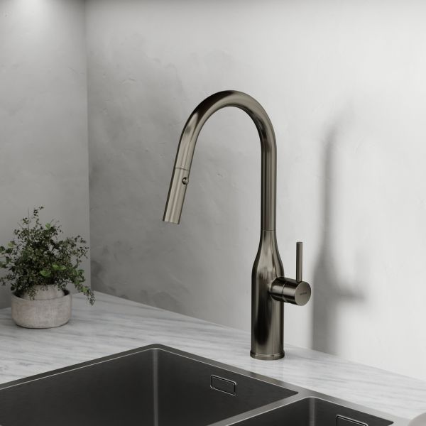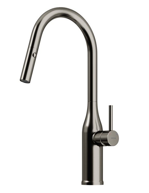 Смеситель для кухни SANCOS Grand c вытяжным и поворотным изливом, цвет вороненая сталь, арт. SC4002GGС возможностью регулировки температуры водыАэратор, гибкая подводка, ключ и крепления для монтажа, ключ для обслуживания аэратора