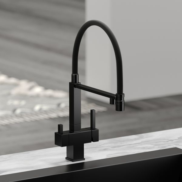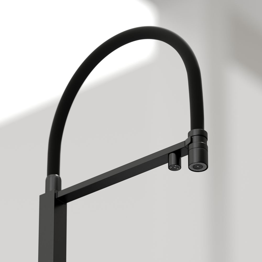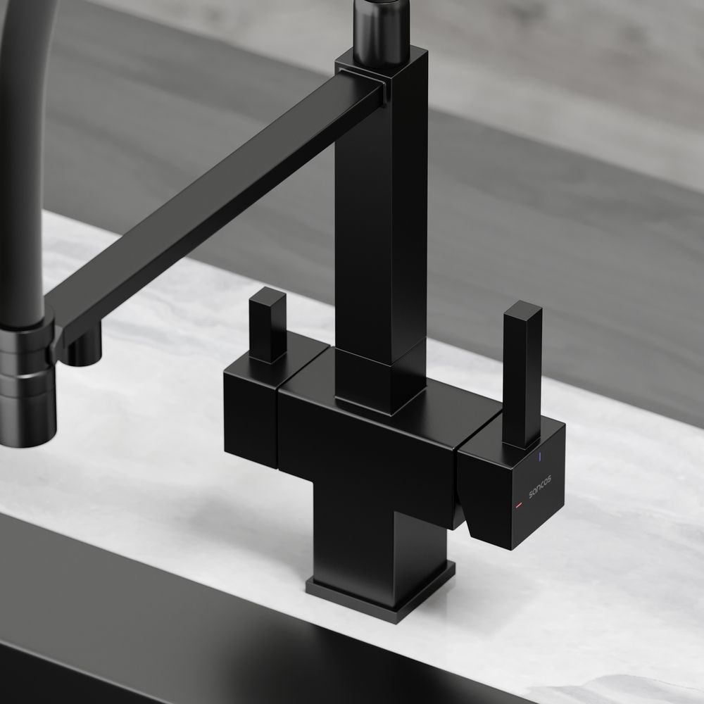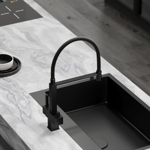 Смеситель для кухни SANCOS Moro с гибким изливом и возможностью подключения фильтра для воды, цвет матовый черный, арт. SC4006MBФункция "Холодный старт" - при включении смесителя активируется холодной поток, для экономии горячей водыАэратор, гибкая подводка, ключ и крепления для монтажа
