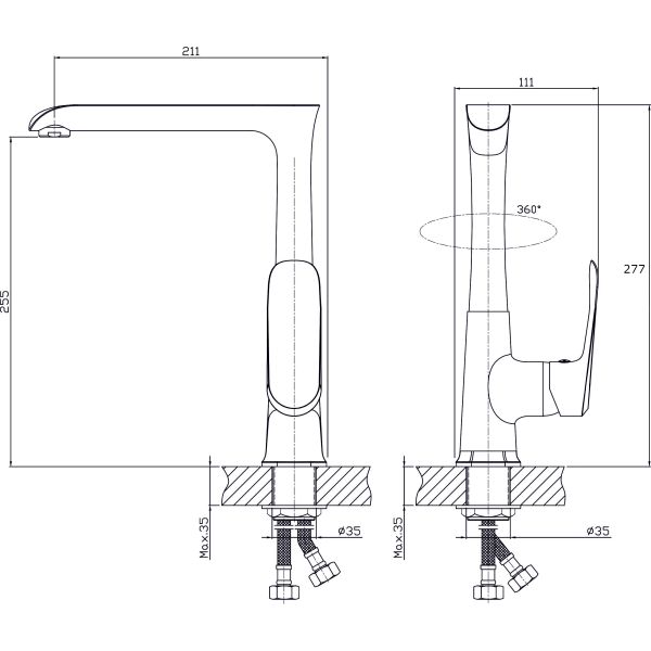 Смеситель для кухни с высоким поворотным изливом RUSH арт. GZ3735-23 с металлической ручкой из коллекции Gozo изготовлен из высококачественной латуни и имеет рычажное управление.В смеситель установлен картридж D-35 с керамическими пластинами. Высота смесителя 277 мм. Излив поворотный, 211 мм. Высота излива до аэратора 255 мм. Аэратор изготовлен из пластика с нержавеющим корпусом.В комплекте гибкая подводка с латунными гайками 35 см - 2шт, универсальная присоединительная группа, фум-лента, индивидуальный пакет, паспорт, гарантийный талон.