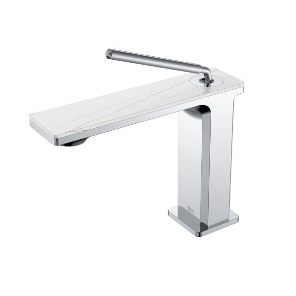 Смеситель для раковины датского производителя Black&White в цвете глянцевый хром. Корпус изготовлен из сантехнической латуни марки HPB 59– безопасного для здоровья сплава с высоким ресурсом. Управление потоком и настройка температуры воды происходит с помощью керамического картриджа повышенной пропускной способности, а на выходе для уменьшения разбрызгивания и экономии воды установлен аэратор. Важная стилистическая особенность —  накладка на излив изготовленная из керамогранита с текстурой  и рисунком белого мрамора. В формах продукта пересекаются цилиндрические и прямоугольные формы, что  гармонично может дополнить концепцию ванной комнаты в экостиле.