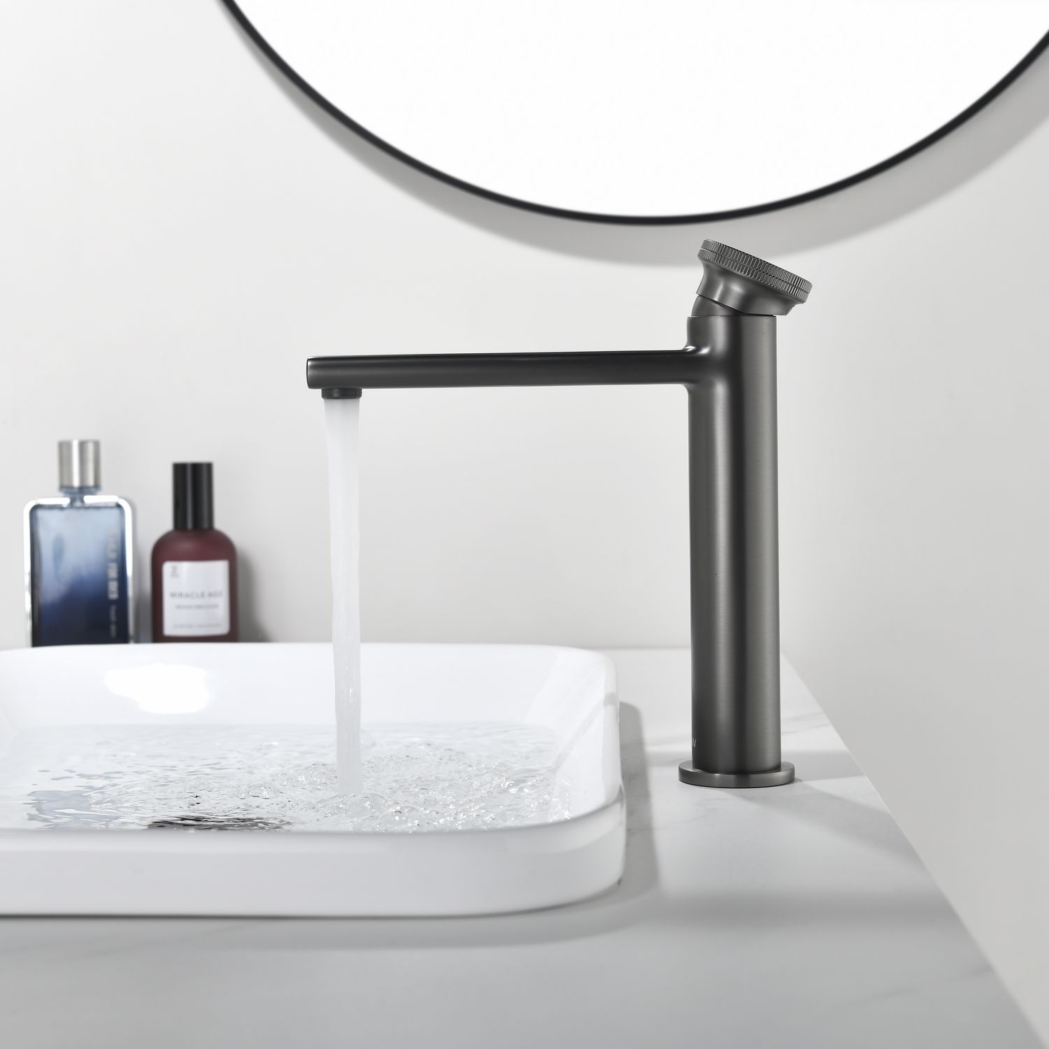 Смеситель для накладной раковины датского производителя Black&White в цвете оружейная сталь. Материал корпуса – сантехническая латунь марки HPB 59,безопасный для здоровья и высокоресурсный сплав.Для настройки температуры установлен керамический картридж прогрессивного типа– давление выдается постоянным , а температура выставляется с помощью круглой ручки с насечками расположенной сверху корпуса. В изделии пересекаются цилиндрические и прямоугольные формы, которые гармонично вольются в современные интерьеры ванных комнат.