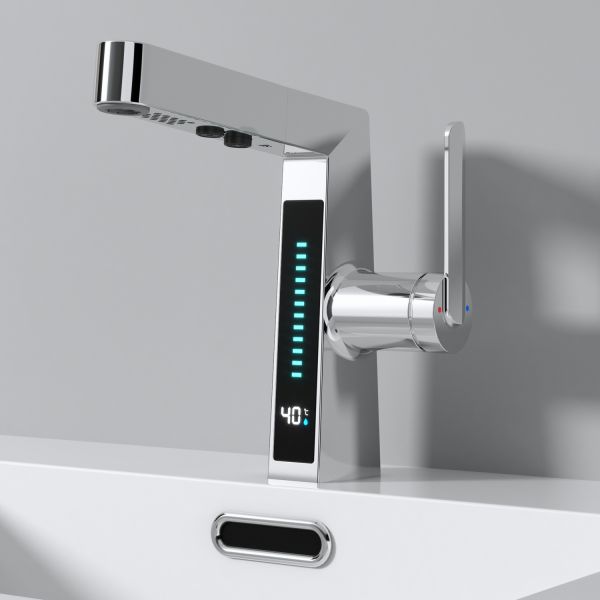 Смеситель датского производителя Black&White в цвете хром. Изделие реализовано в минималистичном дизайне и изготовлено из сантехнической латуни, что увеличивает срок службы и исключает возможность появления коррозии. В нижней части корпуса расположен дисплей с показаниями температуры воды с соответствующей подсветкой температурного режима. Для его работы не требуется электричество- он работает от машины постоянного тока, при прохождении через него потоков воды. Управление происходит через керамический картридж большой пропускной способности. Важным функциональным элементом можно отметить вытяжной излив с поворотным аэратором, на котором также дополнительно есть функция изменения поток воды.