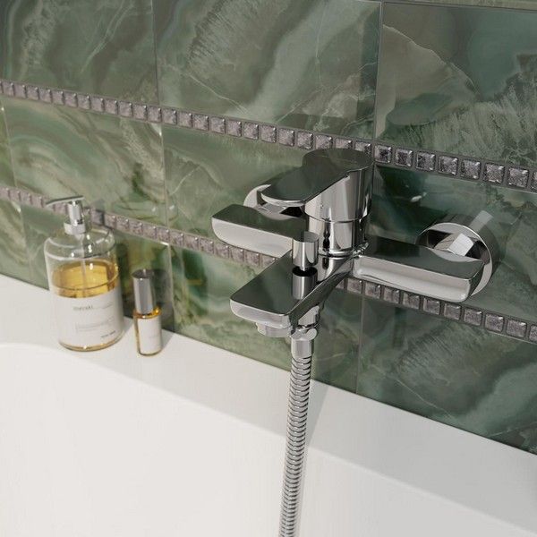 Хромированный смеситель SONATA для ванны выполнен в современном стиле и предусматривает удобное подключение гибкого душа.