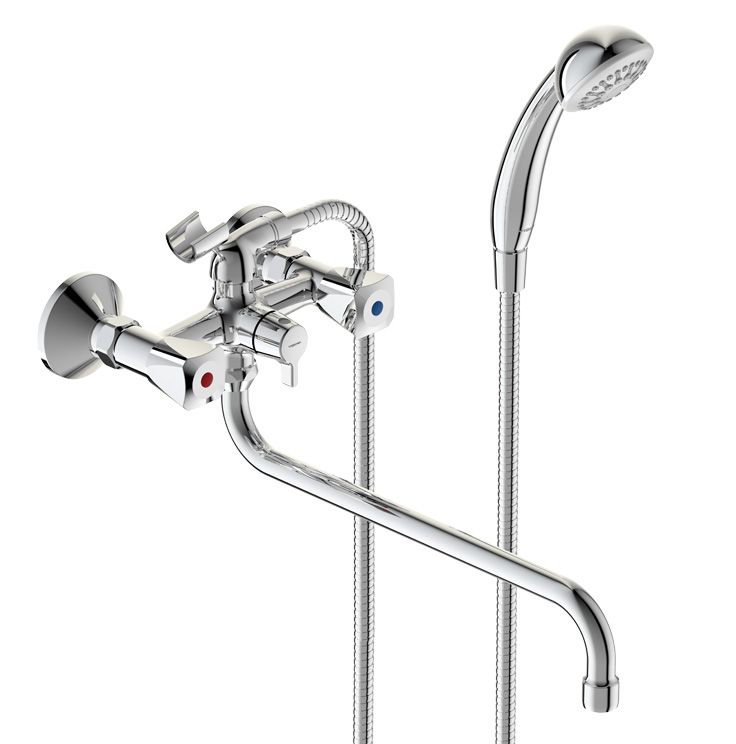 PRACTIC Смеситель для ванны/душа, трубчатый поворотный излив 320 мм с керамическим переключателем, душевой гарнитур в комплекте (душевая лейка Ø70 мм, металлический шланг 1500 мм, держатель для лейки).Смеситель двухрычажный