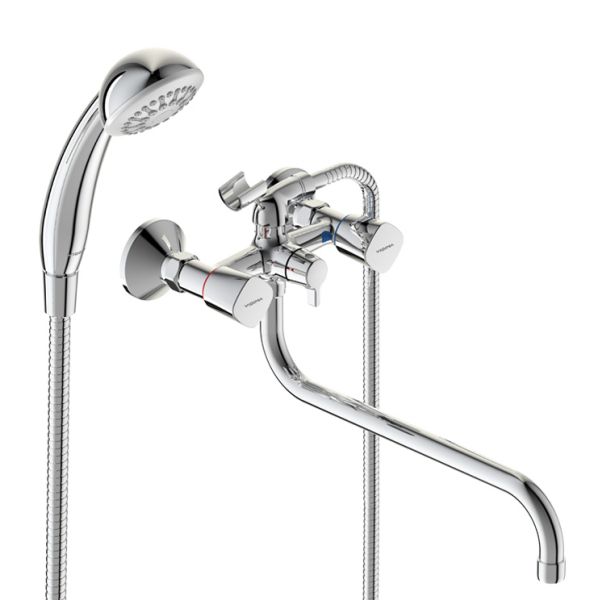 QUADRO Смеситель для ванны/душа, поворотный излив 320 мм, душевой гарнитур в комплекте (душевая лейка Ø70 мм, металлический шланг 1500 мм, держатель для лейки).Смеситель двухрычажный