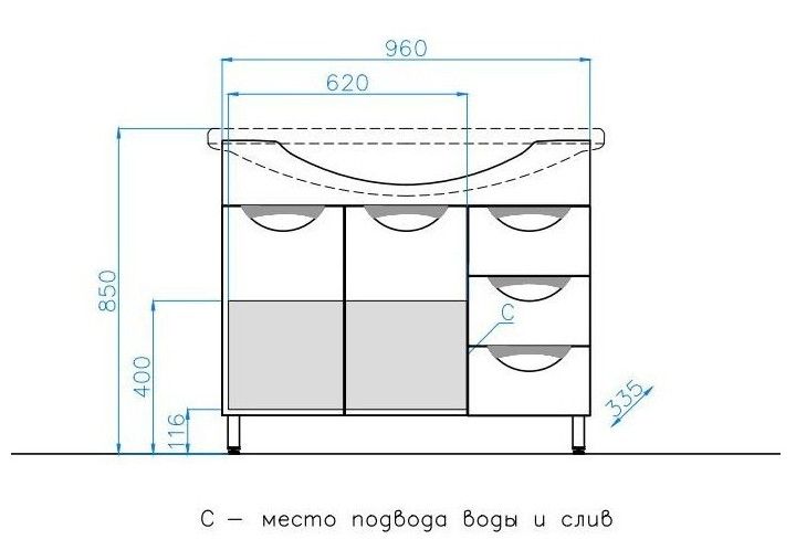 Тумба напольная бренда "Style Line" коллекции "Жасмин" со стильными врезными ручками. Фурнитура - хром, направляющие полного выдвижения Hettich; сборка изделия с помощью эксцентриковых стяжек Hafele; все материалы полностью влагостойкие. Данная тумба предусматривает открытую подводку воды