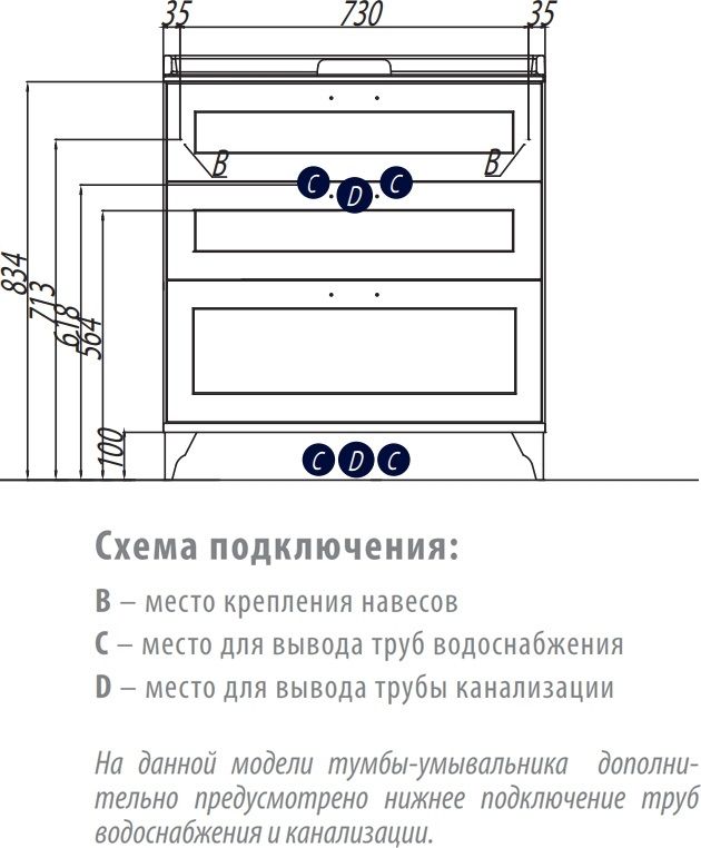 - В тумбе предусмотрена возможность не только заднего, но и нижнего подключения труб водоснабжения и канализации, что значительно упрощает её установку