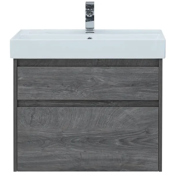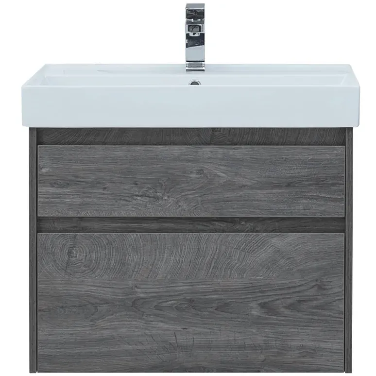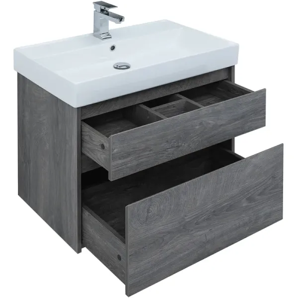 Тумба под раковину Aquanet Nova Lite 60 из влагостойкой ламинированной древесно-стружечной плиты в благородном цвете «дуб рошелье» имеет достойный вид. Фактура натурального дерева выглядит изысканно, а подвесной монтаж придает визуальную легкость тумбе шириной 60 см. Она оборудована двумя выдвижными ящиками. Ящики довольно вместительные и позволяют разместить все необходимое. Фасады выполнены с декоративной интегрированной ручкой, не имеющей острых краев и внутренних углов, что обеспечивает удобство в эксплуатации и легкий уход за мебелью. Направляющие с доводчиками, так что при открывании и закрывании ящикам обеспечен плавный ход и отсутствие неприятных стуков. Неглубокая и стильная керамическая раковина «Латина» идеально подходит к тумбе.