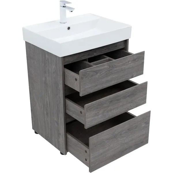 Тумба под раковину Aquanet Nova Lite 60 в исполнении «дуб рошелье» — идеальный вариант для дополнения ванной комнаты в любом из современных стилей. Лаконичный дизайн с претензией на натуральность позволяет освежить санузел смелым решением. Компактные размеры 576*735*442 мм подойдут как для малых помещений, так и для просторных. Напольная модель оснащена ножками и тремя выдвижными шкафами. Пространство внутри организовано для хранения вещей и бытовой химии с учетом коммуникаций для водоотведения. Корпус и фасад мебели изготовлены из влагостойкого ЛДСП, который препятствует образованию плесени и грибка при длительном взаимодействии с водой и влажным воздухом. Выдвижные шкафы оснащены механизмом доведения, что обеспечивает плавное закрытие. В комплект к тумбе можно купить подходящую по размерам керамическую раковину от Aquanet, например модель «Латина», которая легко подсоединяется к мебели.