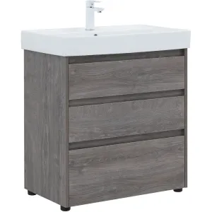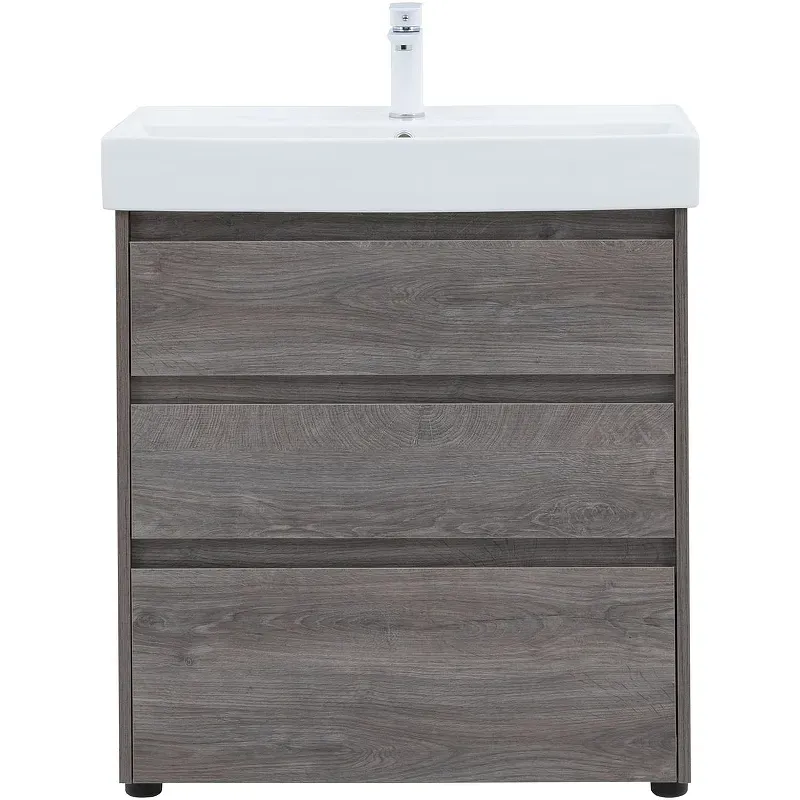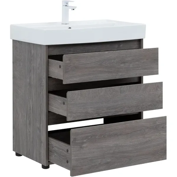 Тумба под раковину Aquanet Nova Lite 75 в исполнении дуб рошелье — идеальный вариант для дополнения ванной комнаты в любом из современных стилей. Лаконичный дизайн с претензией на натуральность позволяет освежить санузел смелым решением. Компактные размеры 724*735*442 мм подойдут как для малых помещений, так и для просторных. Напольная модель оснащена ножками и тремя выдвижными шкафами. Пространство внутри организовано для хранения вещей и бытовой химии с учетом коммуникаций для водоотведения. Корпус и фасад мебели изготовлены из влагостойкого ЛДСП, который препятствует образованию плесени и грибка при длительном взаимодействии с водой и влажным воздухом. Выдвижные шкафы оснащены механизмом доведения, что обеспечивает плавное закрытие. В комплект к тумбе можно купить подходящую по размерам керамическую раковину от Aquanet, например модель «Латина», которая легко подсоединяется к мебели.