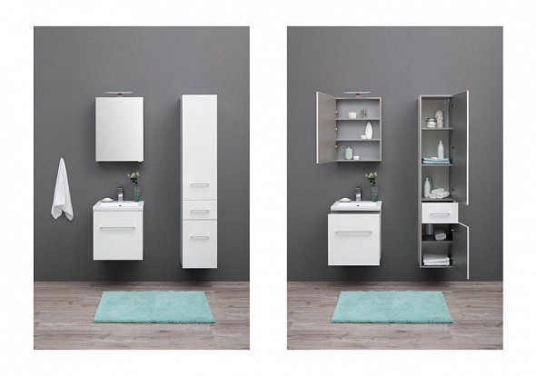 Тумба Aquanet Порто 60 белого цвета отличается стильностью и функциональностью. Внешний ее лаконизм скрывает в себе очень продуманный конструктивизм внутреннего устройства, где невысокий ящик с тремя отделениями скрывается за фасадом основного места хранения, поэтому разместить в этой небольшой на первый взгляд модели шириной 50 см можно много полезных в ванной комнате мелочей, а также найти место для высоких емкостей. Материал фасадов – крашенный белым глянцем влагостойкий МДФ. Для оборудования тумбы использованы петли и доводчики польской фирмы Gamet — одного из крупнейших производителей мебельной фурнитуры и комплектующих в Европе. В этом можно убедиться, оценив качество доводчиков, которые позволяют плавно отодвигать и задвигать ящики, а также убедившись в надежности ручек.