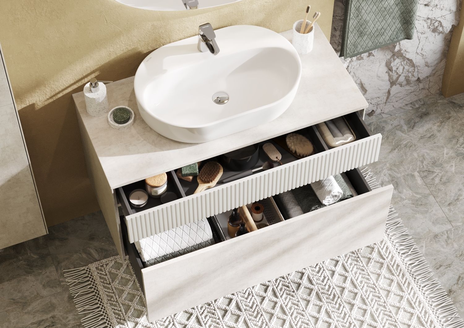 Тумба Марбл 100 функционально состоит из двух вместительных ящиков, оснащенных системой push to open, обеспечивающей надежное, комфортное и бесшумное закрывание. Дополнительно предусмотрены 2 регулируемые планки для внутренней организации пространства. Верхний фасад изделия выполнен из МДФ с реечной фрезеровкой в белой матовой пленке с эффектом soft touch, а нижний фасад и корпус из ламинированной влагостойкой ДСП Слэйт. Верхний и нижний ящики позволяют содержать косметические средства в идеальном порядке. Тумба комплектуется различными по форме накладными раковинами: Santek Одри Soft, Santek Одри Round, Aquaton Лола, Roca Mila круглая и Roca Mila прямоугольная. Раковины продаются отдельно.