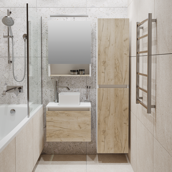 Тумба под раковину в ванную RUNO БАРИ (подвесная) - безупречное сочетание модных тенденций с классическим оформлением ванной комнаты. Тумба под раковину БАРИ оснащена выдвижным ящиком на шариковых направляющих, с системой плавного закрывания. Цвет корпуса классический - белый, при этом цвет фасада в модном цвете – крафтовый дуб, идеально впишутся в любой интерьер ванной комнаты. К тумбе для ванной подойдут умывальники на столешницу: «UNO 24» (24х24см) – очень маленькая модель, идеально подходит для ограниченного пространства в небольших помещениях. Строгая квадратная геометрически правильная форма раковины, усиливает идею лаконичности в дизайне, устанавливается на столешницу, накладным методом. «DUE 38» (38х24см) – маленькая модель, идеально подходит для ограниченного пространства в небольших помещениях. Строгая прямоугольная геометрически правильная форма раковины с округлыми углами, усиливает идею лаконичности в дизайне, устанавливается на столешницу, накладным методом.