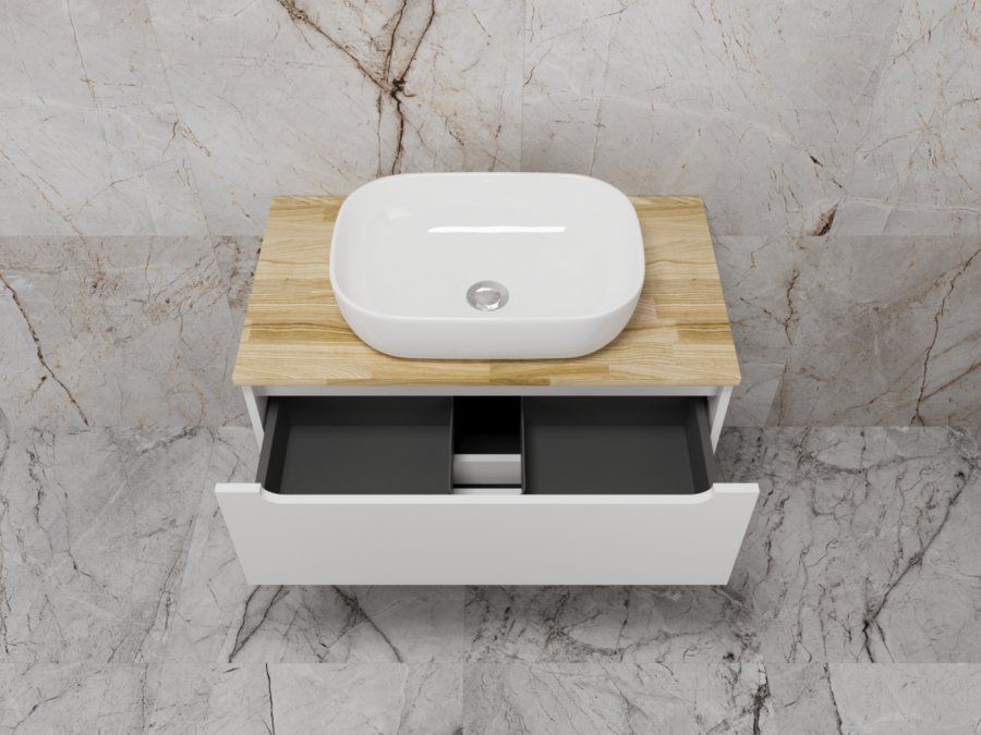 Столешница из натурального ясеня толщиной 20 мм покрыта матовым влагостойким лаком. Фасады и корпус в матовой пленке SOFT TUOCH. Внутренне наполнение из ЛДСП в декоре ГРАФИТ с эргономичным ограничителем под сифон. Фасады без ручек с лаконичным вырезом для комфортного открывания. Выдвижные ящики с системой плавного закрывания SOFT CLOSE. Экологичные и влагостойкие материалы. Легкость в уходе, практичность и стильный внешний вид.