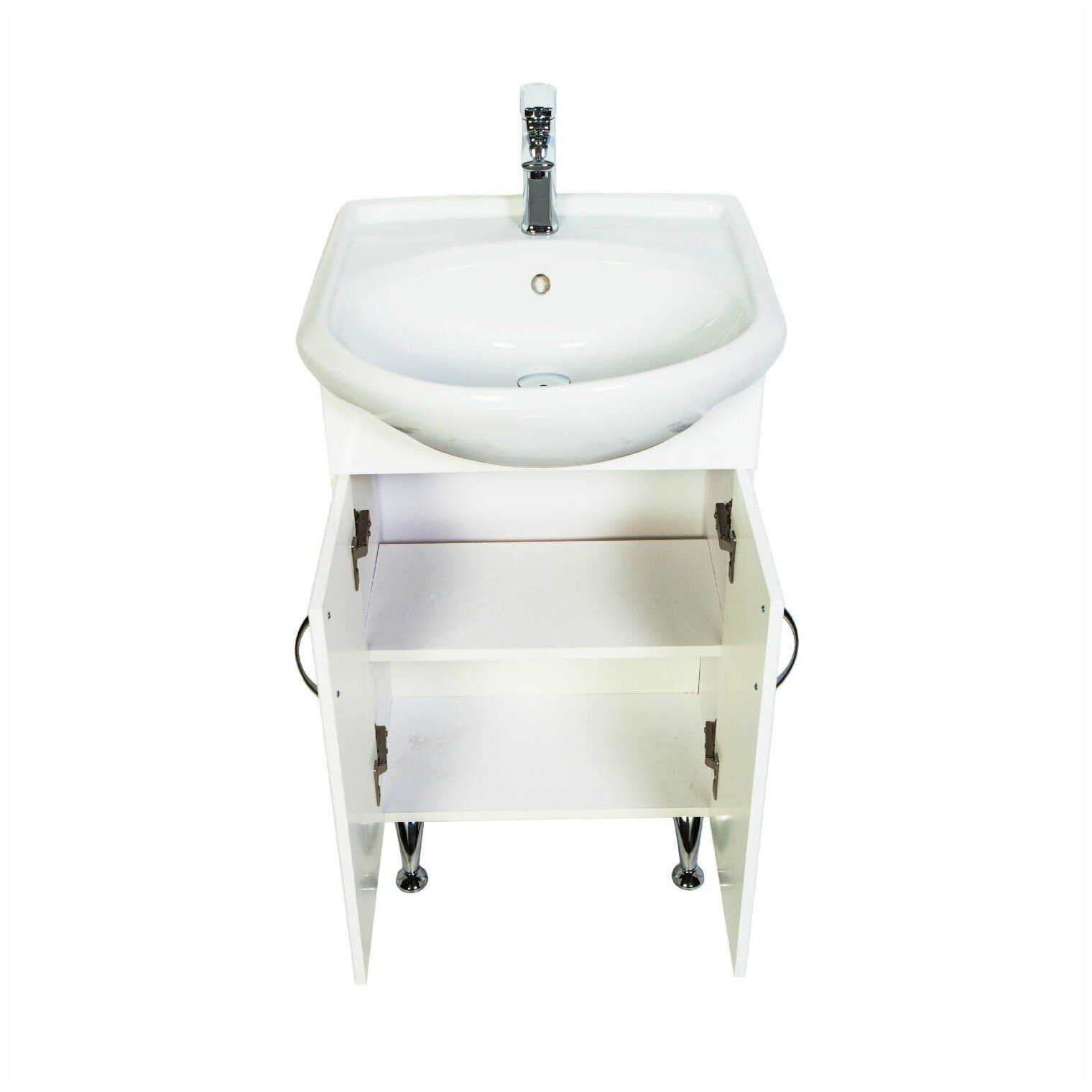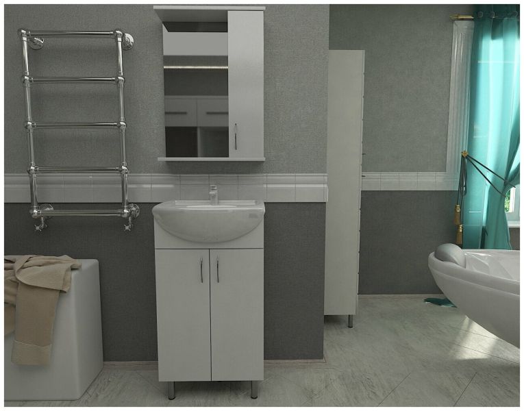 Напольная тумба с раковиной. Дверки c механизмом доводчика, обеспечивающим плавное закрывание. Фасад МДФ в пленке, цвет белый глянец. Корпус ЛДСП - белый глянец. Раковина - фарфор. Фурнитура в цвете хром. В комплекте н-р ножек и внутренняя полочка. Зеркальный шкаф для комплекта (арт. LA-45TUW+RA) приобретается дополнительно.