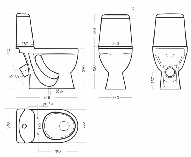 Размеры унитаза-компакта: 340 x 618 x 770
