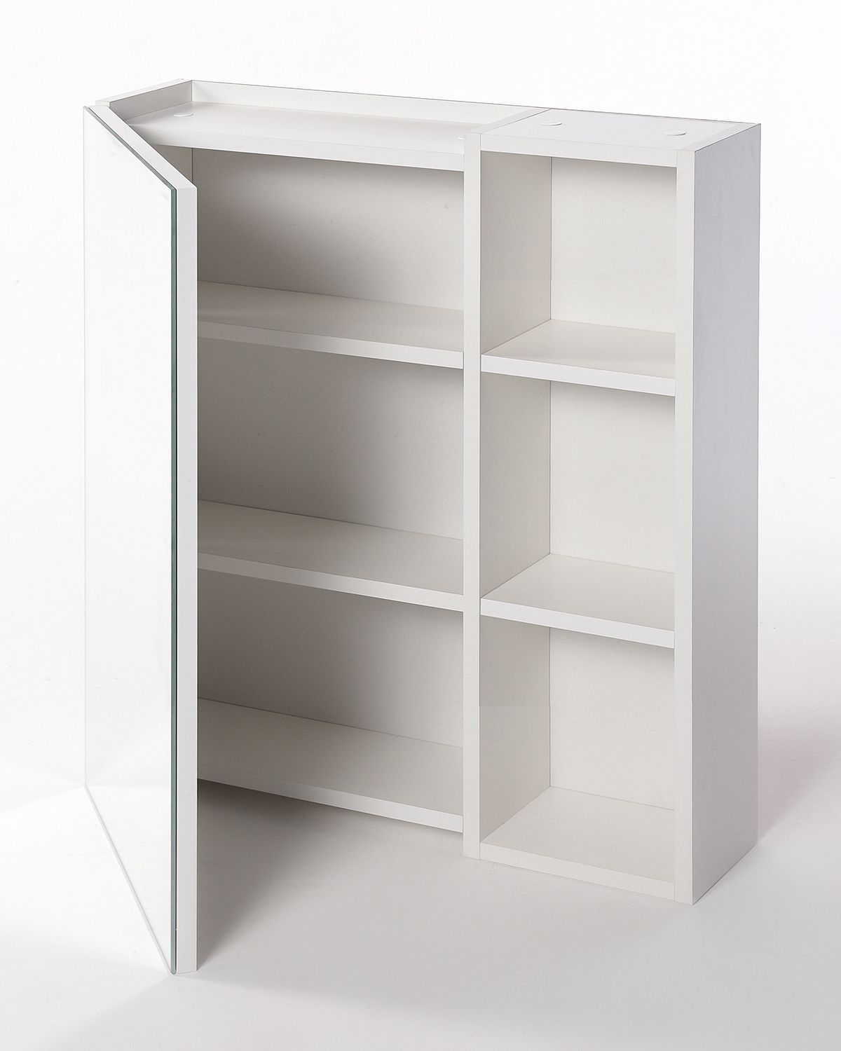 Зеркальный шкаф универсальный. Фасад зеркальное полотно, корпус - ЛДСП в цвете матовый белый. Дверца с механизмом доводчика, обеспечивающим плавное закрывание. В комплекте внутренние полочки (ДСП) - 4 шт.